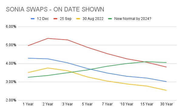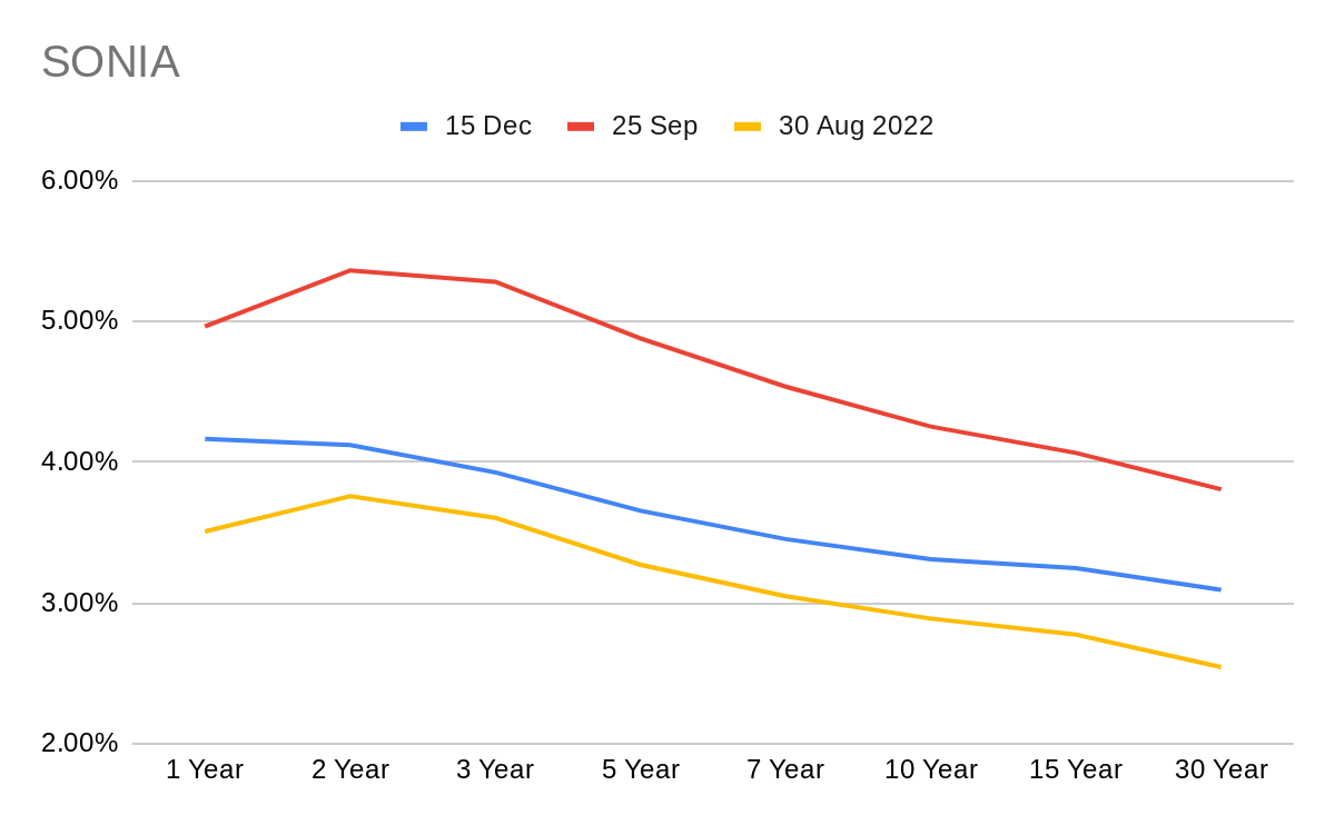 The graph above shows the SONIA rate, this forms the basis for pricing of residential mortgages in the UK. New mortgage fix rates offered are taken off the corresponding year on the horizontal axis. The 3 lines here are in yellow the level at the end of the summer, in red just after the Liz Truss Mini Budget and in Blue on 15 Dec. Clearly the rate shot up just after the budget but the line now is back very close to that at the end of the summer, just 0.4% or so above at the 5 year rate for example. However, 5 year BTL fix rates at the end of the summer were around 3-4% and they are now 5.5-6.5%, a huge gap. Why is this if their SONIA plots are so close? It is all down to stability. Rates need to find a certain stable level for banks to get confidence to slim their margin above the so-called "risk free" SONIA level. Additionally, stable rates will lead to a growth in competition between banks on rate levels, driving them down further towards the SONIA line.
