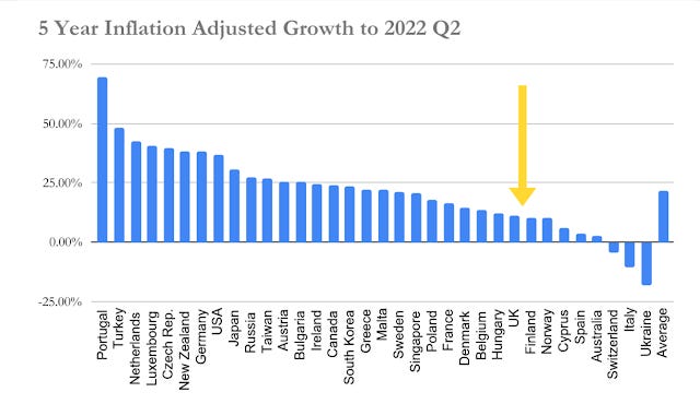 First, a look at how the UK market has performed on a global stage. Despite the media frenzy about how affordable the market is, the UK is a true laggard when measured over the last 5 years across the world and shows we have not got too far "over our skis" as compared to some other countries.