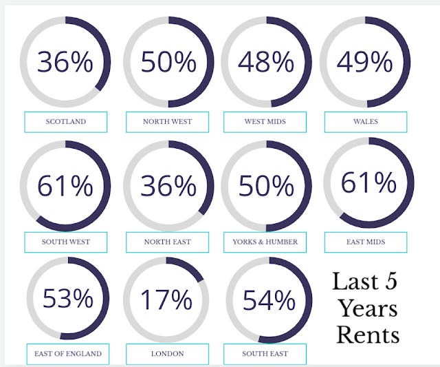 We said above that rents tend to follow wage increases and when looking at existing rent levels this is the case to a close regard. However, looking at just newly-created tenancies over the last 5 years using regional data from Rightmove we see that rents outside of London have increased dramatically. This has the effect of supporting prices for property bought as an investment and also in driving motivation for long-term renters to buy as this can be cheaper.
